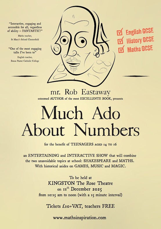 In this engaging and interactive show, award-winning author Rob Eastaway reveals the surprising mathematical connections between Shakespeare and the world he lived in. Find out how Tudors multiplied, why dice games were a hazard for the unwary, and why Shakespeare really did make much ado about 'nothing'.