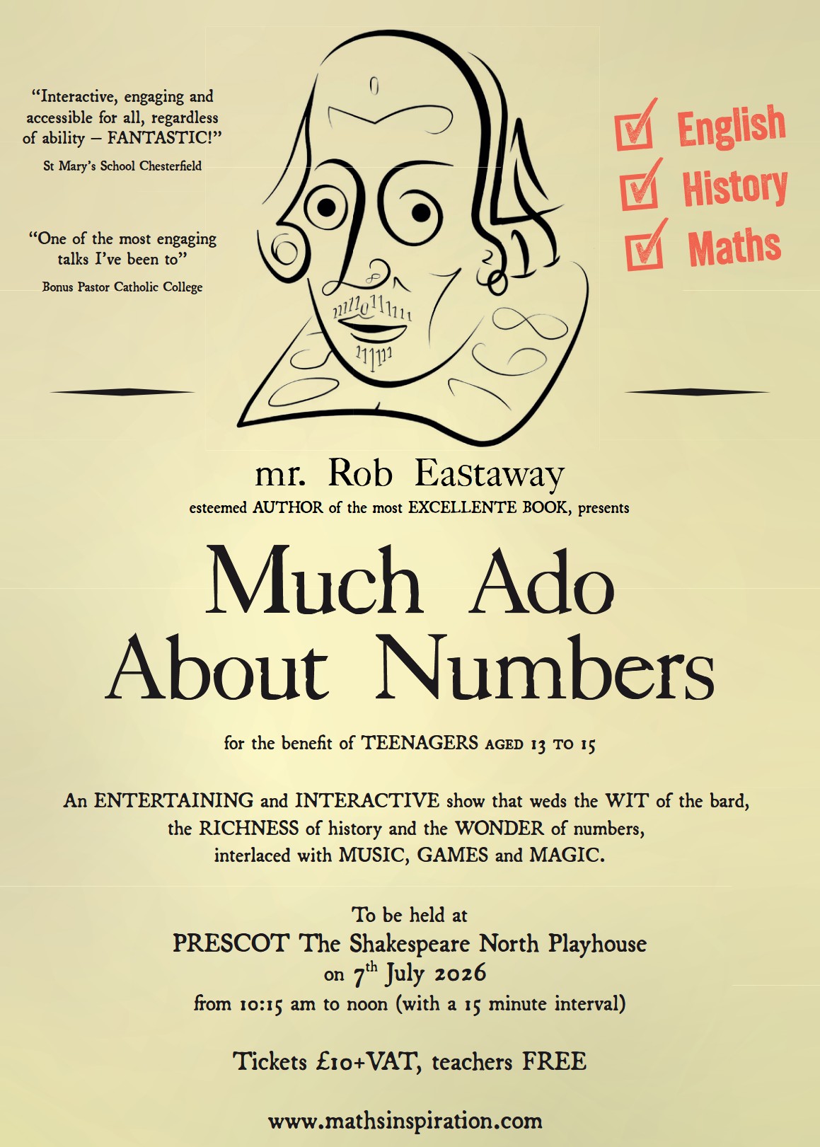 In this engaging and interactive show, award-winning author Rob Eastaway reveals the surprising connections between Shakespeare and the fascinating world of numbers. Using the Bard’s finest works, discover how Tudors multiplied, why dice games were a risky business, and why Shakespeare really did make much ado about ‘nothing’.